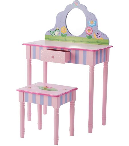 La coiffeuse Magic Garden avec son tabouret assorti offre à votre petite l'endroit idéal pour se pomponner et ressembler à une vraie princesse. Le tabouret sculpté à la main offre un endroit confortable pour que votre fille puisse se reposer tout en se regardant dans un joli miroir très chic. Le design de fleur et grenouille offre une ambiance ludique qui fait plaisir à se préparer. -DIMENSIONS - Table de coiffeuse : 67.30 cm (L) x 31.1 cm (l) x (H) 99.1 cm - Tabouret : 36.20 cm (L) x 29.80 cm (l) x 38.10 cm (H). - VERITABLE MIRROIR ET ESPACE DE RANGEMENT ? La coiffeuse comprend un vrai miroir pour encourager votre enfant à se regarder avec beaucoup de plaisir. La coiffeuse est aussi munie d?un tiroir central dans la table de coiffeuse. Il peut être utilisé pour ranger tous les accessoires précieux et indispensable pour se faire belle tels que les pinces à cheveux, bandeaux pour les cheveux, bracelets, rouge à lèvres etc. -CONCEPTION POLYVALENTE ? La table de coiffeuse et son tabouret assorti Magic Garden est sculpté et peint à la main avec beaucoup d'éléments de jardin rose et violet et des créatures sauvages. Cet ensemble de coiffeuse et tabouret a un très joli design accrocheur et est sûr d'être adulé par votre enfant. Cet ensemble coiffeuse peut s?associer aux autres meubles enfant de la collection Magic Garden de Fantasy Fields. - SANS DANGER POUR LES ENFANTS ? Ce joli ensemble comprenant la table de coiffeuse et son tabouret assorti est peint avec de la peinture non toxique est donc sans danger pour vos petits à utiliser, et les bords sont arrondis pour empêcher les enfants de se blesser. C?est le meuble de chambre en bois idéal pour les activités d'apprentissage et le divertissement des enfants. - CONSTRUCTION EN BOIS TRES ROBUSTE ? table de coiffeuse : 67.30 cm (L) x 31.1 cm (l) x (H) 99.1 cm Tabouret : 36.20 cm (L) x 29.80 cm (l) x 38.10 cm (H). Les pieds de la table et du tabouret sont créés en bois massif, non MDF, ils peuvent supporter jusqu'à 45 kg. Ceux-ci sont conçus pour vous garantir la solidité de cet ensemble coiffeuse et peut être utilisé par les enfants sans risque. ...