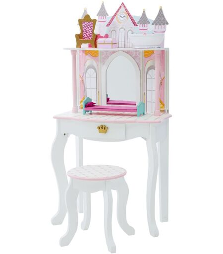 Avec un design de château inspiré de la Renaissance culminant au sommet de la coiffeuse, la coiffeuse enfant Dreamland Castle de Fantasy Fields sera l?ajout idéale dans toute chambre d?enfant, de petite fille ou salle de jeux. Fabriquée avec un bois solide de haute qualité, cette coiffeuse enfant est livrée avec un tiroir central coulissant avec une ravissante poignée en forme de couronne dorée, un miroir incassable et un tabouret assorti. Offrez à votre enfant un meuble magique pour se préparer pour le bal royal ! La coiffeuse enfant mesure (cm) : 59.56 (L) x 28.58 (l) x 116.84 (H). Le miroir est fabriqué en plexiglas incassable sans danger pour votre enfant. La coiffeuse enfant royale est livrée avec 4 accessoires : 1 trône, 1 lit, 1 baignoire et 1 coffre à trésor parfait pour que votre enfant s'amuse pendant des heures ! Assurez-vous que votre tout petit ne soit jamais en retard au bal en lui apprenant le concept du temps et à lire l?heure grâce à l?horloge de jeu qui se trouve au sommet du château. - DETAILS : parfaite addition dans toute chambre d?enfant, fille ou salle de jeux. La Coiffeuse enfant Dreamland Castle de Fantasy Fields offre un design unique avec son château inspiré de la renaissance, un tiroir central coulissant pour ranger tous les accessoires, un miroir et un tabouret royale assorti. - 4 ACCESSOIRES COMPRIS : 1 trône, 1 lit, 1 baignoire et 1 coffre à trésor. - SECURITE : le miroir arrondi est fabriqué avec un verre type plexiglas incassable sans danger pour les enfants. La table de coiffeuse et le tabouret sont dotés de coins arrondis et de pieds échancrés. - DURABILITE: fabriquée avec bois à particules solide et résistant aux coups et aux agitations du jeu quotidien. Essuyez facilement avec un chiffon humide. - MONTAGE : La notice est fournie. Montage rapide et facile en moins de 30 minutes. La coiffeuse enfant mesure (cm) : 59.56 (L) x 28.58 (l) x 116.84 (H). La coiffeuse enfant dans son emballage mesure (cm) : 69.2 (L) x 43.8 (L) x 31.8 (H). La coiffeuse enfant convient aux enfants âgés de + 3 ans. ...