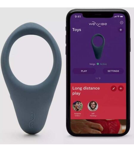 L’Anneau Vibrant Connecté Verge de We-Vibe viendra vous combler de plaisir et parfaire vos moments coquins à deux. En effet Verge accentuera vos sensationset vous emmènera au septième ciel en un instant ! L’Anneau Vibrant Connecté Verge de We-Vibe amplifiera vos sensations durant vos rapports intimes. Cet anneau procurera du plaisir aussi bien à Monsieur qu'à Madame. Il aide Monsieur à obtenir une érection solide, plus ferme et retarde l'éjaculation en diminuant le flux sanguin. Dernier avantage pour lui, la languette vibrante qui, positionnée vers le bas, viendra stimuler son périnée, zone érogène et sensible chez l’homme, pour avoir des orgasmes explosifs ! Quant à Madame, en plus des avantages de Monsieur qui ont une répercussion directe sur votre plaisir, vous aurez la joie de profiter d'une incroyable stimulation clitoridienne par le biai de cette même languette si elle est orienté vers le haut. Vos sensations seront décuplées pendant la pénétration et vous atteindrez plus rapidement l'orgasme ! L’Anneau Vibrant Connecté Verge a un design élégant et une forme particulière. La partie qui stimule le périnée ou le clitoris est épaisse, longue et recourbée pour atteindre plus facilement et précisément le clitoris ou le périnée afin de les stimuler efficacement. Positionnez l’anneau sur la verge de votre pénis, activez les vibrations et profitez de moments à deux uniques ! Verge est fabriqué en silicone lisse, incroyablement doux et très extensible pour s'adapter à toutes les tailles de pénis. Doté d’un petit moteur puissant mais silencieux, vous disposerez de 10 modes de vibration et bien plus encore si vous connectez votre jouet à votre smartphone ! Un bouton simple et discret vous permet de contrôler manuellement votre anneau vibrant. Verge de We Vibe est également équipé d'un système d'alerte lorsque la batterie est faible. Ainsi vous ne risquez pas d’être interrompu pendant vos ébats. Verge de We-Vibe est donc un sextoy connecté. Cela signifie qu’il se connecte avec les appareils iOS et Android. Vous pouvez désormais contrôler le plaisir de votre partenaire en vous connectant simplement en Bluetooth 4.0 (sans inscription) et créer/enregistrer des modes de vibration personnalisés (mode, intensité et durée de vibration), tout cela de n'importe où dans le monde en quelques secondes. Avec l'application vous pouvez vous connecter aussi bien en étant dans la même chambre qu'en étant sur deux continents différents. Créez des modes de vibration personnalisés, enregistrez-les et jouez-en à l’infini. Comment utiliser un sextoy We-Vibe avec son smartphone ? Téléchargez l'application We-Connect sur l' App Store ou sur Google Play Store. Connectez votre sextoy à votre smartphone via Bluetooth. Il ne vous reste plus qu'à jouer ! Vendu avec son coffret de rangement discret et compact, son chargeur, un échantillon du Lubrifiant Eau We-Vibe Lube et le manuel d'utilisation. Son socle de chargement sert à la fois de chargeur et de boîte de rangement.... ...