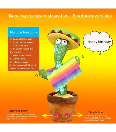 Peluche danse Cactus chant électrique torsion Cactus musique enregistrement de la chanson parler jouet enfants éducation petite enfance décoration de TableSpécification:Taille: 32*12*12cmType: corps tordu, torduMatériel: PelucheModèle de batterie et quantité: 3 piles alcalines AAA (batterie non incluse)Conseil: ne pas laver.Style: A: Hat cape 120 enregistrements B: USB Bluetooth-compatible 120 enregistrements C: 3 chansons anglaises chapeau D: Hat cape 120 chansons anglaisesNote:1. En raison du moniteur différent et de l'effet de lumière, la couleur réelle de l'article peut être légèrement différente de la couleur montrée sur les images. Merci!2. Veuillez permettre un écart de mesure de 1 à 2cm en raison de la mesure manuelle. 1 X jouet Cactus dansant ...