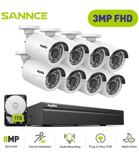 SANNCE Kit de Vidéosurveillance Exterieure 3MP 8×IP Caméras Smart IR Vision Nocturne,Détection Mouvement Kit Caméra de Surveillance Filaire 1TB