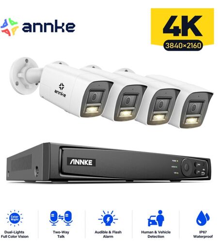 ANNKE 4K Kit de Vidéosurveillance Exterieure 8CH nvr 4×Caméras Intelligente Double Lumière Audio 2 Voies,Vision Nocturne,Détection Mouvement Kit Caméra de