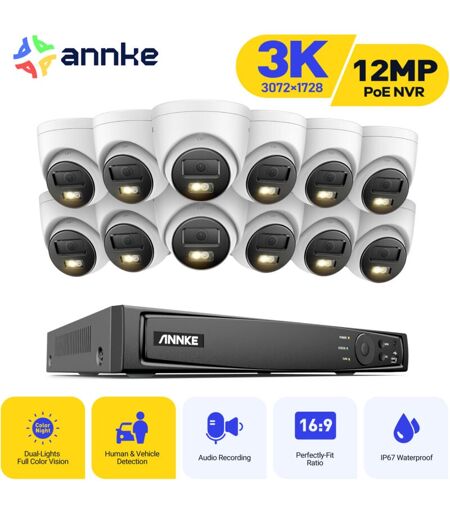 ANNKE 3K Caméra de Surveillance Extérieure,Kit Vidéo Surveillance avec 16CH NVR et 12X5MP Caméra IP PoE,Vision Nocturne Couleur,Détection