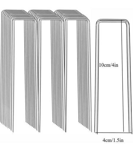 Specifications; Chimique Hign-concerné:Aucun; Type de kit:YES; Matériau:Acier inoxydable; Material:Galvanized Steel; Nom : agrafes de paysage en forme de U.; Matériau : fil d'acier enduit de zinc; Taille :; S-2.2*40*100mm; m-2.2*40*150mm; L-2.2*40*200mm; Champ d'application : jardinage, agriculture, tente, etc.; Fonction : utilisé pour fixer les serres, les réseaux anti-poussière, les réseaux pare-soleil et les toiles de jardinage pour éviter d'être gonflés par le vent.; Quantité: 10/50/100 pièces; ..La livraison depuis la France est prévue dans 5 jours ouvrés, n'hésitez pas à passer votre commande ...