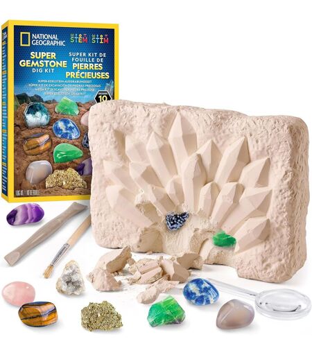 DÉCOUVREZ 10 VÉRITABLES GEMMES - Ce kit d'excavation comprend 10 pierres précieuses améthyste, géode, pyrite, quartz rose, ae grise, aventurine verte, fluorite verte, obsidienne flocon de neige, sodalite et ?il de tigre.IDENTIFIEZ CHAQUE GEMME - Feuille d'identification en couleur incluse pour repérer rapidement chaque gemme dans la nouvelle collection de roches des enfants. Elle contient aussi des faits fascinants sur chaque gemme dans le bloc d'excavation.EXCAVEZ AVEC LES OUTILS - Comme un vrai géologue, les enfants utilisent les outils fournis outil d'excavation, brosse pour creuser et loupe pour admirer la beauté naturelle de chaque pierre.DÉMARRAGE COLLECTION ROCHE - Bloc d'excavation Super Gemmes, parfait pour initier enfants à collection de roches ! Kit encourage émerveillement, passion sciences terrestres, alors enfants extraient gemmes et découvrent.JOUETS ÉDUCATIFS DE HAUTE QUALITÉ - Nous sommes fiers de fabriquer des jouets scientifiques pratiques de la plus haute qualité, et tous nos produits sont soutenus par un service exceptionnel. Si votre expérience est moins que stellaire, faites-le-nous savoir et nous arrangerons les choses !AttentionNe convient pas aux enfants de moins de 8 ans. À utiliser sous la surveillance d'un adulte.La livraison depuis la France est prévue dans 5 jours ouvrés, n'hésitez pas à passer votre commande ...