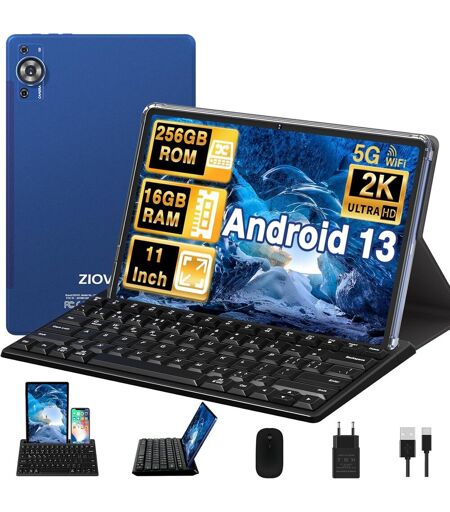 16Go RAM+256Go ROM/TF 1TB+5G WiFi Tablette Android 13 dispose d'une énorme capacité intégrée de 16 Go (8+8) de RAM + 256 Go de ROM, extensible jusqu'à 1 To à l'aide d'une carte SD, vous pouvez utiliser les applications et le multitâche plus facilement et stocker un grand nombre de fichiers ; elle prend également en charge le double bande à grande vitesse 802.11ac, ce qui vous permet de vous connecter à n'importe quel réseau WiFi 2.4G ou 5G à tout moment et n'importe où.Android 13 OS + Processeur Octa-CoreTablette 11 pouces de ZIOVO est équipée du système d'exploitation ""Android 13 OS"" (certifié GMS) ; la tablette est également équipée d'un processeur octa-core cadencé à 2,0 GHz pour d'excellentes performances et une bonne aptitude au travail ; Android 13 OS offre une expérience système plus personnalisée, plus sûre et plus facile à utiliser, ainsi que des paramètres plus personnalisables (Widgets, écran divisé, etc).Écran FHD 2K + de 11 Pouces + Caméra HDTablette Z128 est équipée d'un nouvel écran FHD de 11 pouces avec un angle de vision complet et une résolution de 2000*1200, qui fournit des images détaillées et des couleurs réalistes pour des effets visuels époustouflants. Boîtier métallique protecteur pour une excellente sensation tactile¿La tablette est équipée de 3 caméras, 5MP à l'avant + 1300MP à l'arrière + 200MP macro caméra, qui peuvent capturer tous les moments merveilleux et précieux de votre vie quotidienne.Batterie 8600mAh+Haut-Parleurs DoublesTablette Tactile est équipée d'une batterie haute capacité de 8600mAh, la combinaison de la batterie haute capacité et de la tablette optimisée garantissant une durée de vie plus longue ; la tablette pèse environ 500 grammes, ce qui la rend facile à transporter à tout moment, et donc adaptée aux déplacements sur de longues distances ; les doubles haut-parleurs avec une qualité sonore cristalline vous offrent une expérience audio de haute qualité.Tablette Portable 2 en 1Tablette Z128 est livrée avec un clavier Bluetooth haut de gamme et une souris sans fil, qui la transforment en mini-ordinateur portable lorsqu'elle est connectée. Cette polyvalence en fait un appareil idéal pour la productivité en déplacement et vous permet de traiter efficacement et rapidement vos tâches quotidiennes ; elle est également livrée avec un étui de protection pliable qui protège la tablette dans toutes les directions contre les dommages.Remarque La tablette PC Z128 a une impression de tablette noire uniforme sur le dessus de la boîte. La couleur réelle de la boîte est la même que celle de la tablette que vous avez achetée !merci!.La livraison depuis la France est prévue dans 5 jours ouvrés, n'hésitez pas à passer votre commande ...