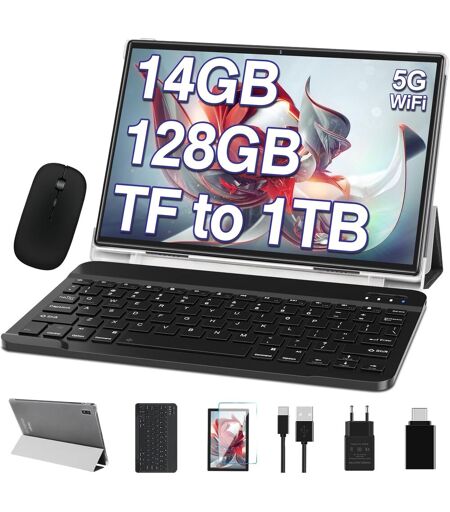 KALWS-Tablette 10 Pouces Fhd Android Tablette Tactile,14Go Ram+128Go Rom/Tf 1To,Octa-Core,2Ghz,5G Wifi,8000Mah,5+8Mp,Bt 5.0,Certifié Gms,Agps,Tablette 2 En 1 Avec Clavier+Souris-Gris