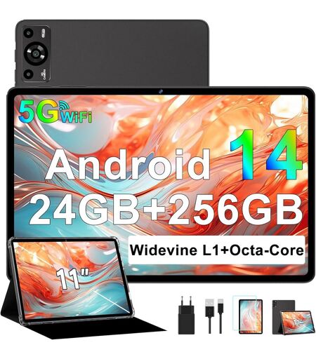KALWS-Tablette 11 Pouces Tablette Android 14,24Go Ram+256Go Rom/Tf 1To,Octa-Core 2.0Ghz,5G Wifi/8000Mah/13+5Mp/Gms Certified/Couvercle Métallique/Widevine L1Tablette Tactile -Noir