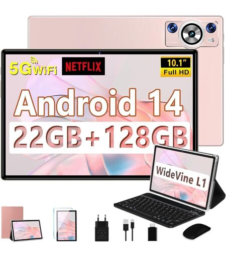 KALWS-2025 Newest Tablette Android 14,Tablette 10.1 Pouces 22Go Ram+128Go Rom(Tf 1To),8 C?urs 2.0Ghz,5G Wifi,Gms,8000Mah/Widevine L1/Fhd/Bt5.0/Gps/Tablette 2 En 1 Avec Clavier Souris-Or Rose