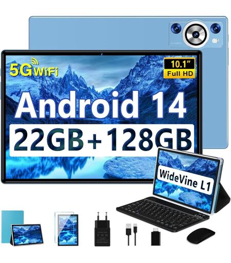 KALWS-2025 Newest Tablette Android 14,Tablette 10.1 Pouces 22Go Ram+128Go Rom(Tf 1To),8 C?urs 2.0Ghz,5G Wifi Gms,8000Mah/Widevine L1/Fhd/Bt5.0/Gps/Tablette Avec Clavier Souris-Bleu