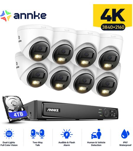 ANNKE 4K Kit de Vidéosurveillance Exterieure 8CH nvr 8×Caméras Intelligente Double Lumière Audio 2 Voies,Vision Nocturne,Alarme E-Mail Kit Caméra de