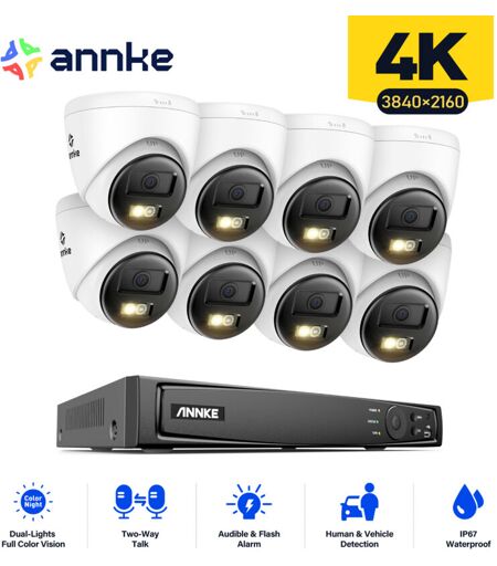 ANNKE 4K Kit de Vidéosurveillance Exterieure 8CH nvr 8×Caméras Intelligente Double Lumière Audio 2 Voies,Vision Nocturne,Alarme E-Mail Kit Caméra de