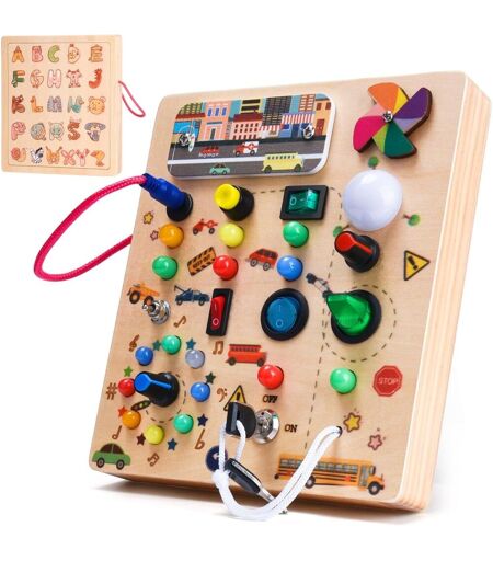 NauotK Planche Montessori, Busy Board en Bois pour Bébé 3+ Ans, Activity Board avec 19 Lumiere, Motricité Bébé Jouet Educatif Sensoriel, Voyage Portable Tableau d¿activité Cadeau pour Garçons & Filles