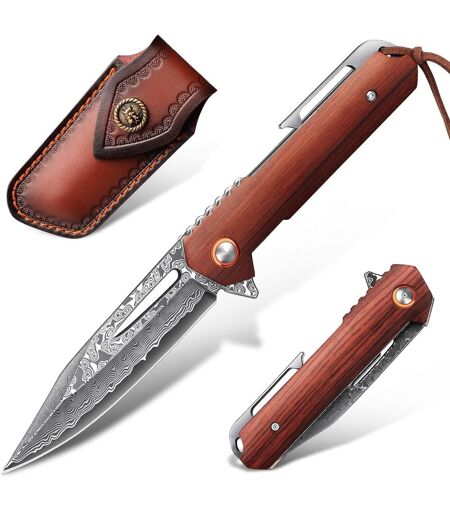 Damast Couteau De Poche Pliant Couteau D'extérieur Avec Lame En Acier Damassé Vg10,Manche En Bois,Étui En Cuir,Idéal Pour Le Camping,La Randonnée,La Survie,La Collecte Ou Le Cadeau