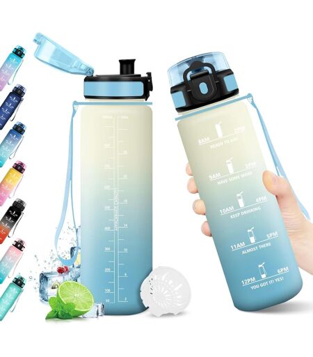 GOURDE SPORT DE HAUTE QUALIT¿¿ Cette bouteille d'eau est fabriqu¿¿e en plastique de qualit¿¿ alimentaire et ne contient pas de BPA ni de substances nocives, ce qui rend son utilisation plus s?re. La bouteille sport est solide et durable, parfaite pour un usage quotidien.RAPPEL DHYDRATATION La bouteille est ¿¿quip¿¿e de rep¿¿res horaires et de messages de motivation pour vous aider ¿¿ organiser votre consommation deau. Id¿¿ale pour les ¿¿tudes, le travail, le sport ou d'autres activit¿¿s, cette gourde motivation vous rappelle de boire r¿¿guli¿¿rement tout au long de la journ¿¿e.GOURDE ¿¿TANCHE La gourde est munie d'une bague en silicone et est 100 % ¿¿tanche, m¿¿me pour les boissons gazeuses. Le bouchon ¿¿ verrouillage de s¿¿curit¿¿ emp¿¿che toute ouverture accidentelle, de sorte que la gourde sport peut ¿¿tre rang¿¿e en toute s¿¿curit¿¿ dans un sac ¿¿ dos, une voiture ou un porte-bouteille.OUVERTURE ¿¿ UNE TOUCHE La bouteille est ¿¿quip¿¿e dun couvercle ¿¿ ouverture rapide, facile ¿¿ utiliser dune seule main. Le bouchon avec filtre ¿¿ fruits vous permet dajouter des gla?ons, des fruits ou du th¿¿ pour aromatiser vos boissons. Les gourdes sont id¿¿ales pour les trajets quotidiens, l'entra?nement, les cours et les activit¿¿s de plein air.LARGE CHOIX DE COULEURS Les gourdes sont disponibles dans un choix de couleurs et trois capacit¿¿s et ont une finition mate antid¿¿rapante. Cette gourde ¿¿l¿¿gante est un cadeau parfait pour un anniversaire, No?l ou ¿¿ offrir ¿¿ vos proches. Expédié depuis la France et arrive sous 7 jours. ...