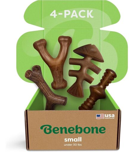 Lot de 4 jouets à mâcher Benebone pratiquement indestructibles, 1 triangle de bacon, 1 bâton d'érable, 1 bacon zaggler et 1 arête de poisson Jack Saumon. Cadeau parfait pour la chaussette de Noël Parfait pour les petits chiens jusqu'à 13,6 kg, comme les Jack Russels et les teckels.Mâcher pour chien durable pour les chiens forts qui aiment mâcher. Les Benebone sont indestructibles et résistants pour les mâcheurs agressifs, incurvés pour une prise en main agréable aux pattes, et fabriqués avec un délicieux nylon infusé à saveur réelle que votre chiot adorera.Saveurs 100 % authentiques nous n'utilisons que des saveurs 100 % réelles, telles que le bacon, le poisson et même le bois. Il n'y a que 2 ingrédients 100 % de saveur véritable, et nylon, donc pas de produits chimiques ajoutés.Usure bien que les Benebone soient durables, nous vous recommandons de les jeter ou de les recycler après un mois, ou plus tôt, pour être sûr. S'il manque plus d'un produit en cubes de sucre, il est temps de partir.À propos du Benebone développé aux États-Unis, Benebone n'utilise que de vraies saveurs et se concentre sur le développement de friandises à mâcher durables conçues pour divertir votre chiot pendant des heures. Vous voulez discuter ? Contactez-nous directement et vous obtiendrez une vraie personne dont le seul travail est de vous rendre heureux, vous et votre chiot. Expédié depuis la France et arrive sous 7 jours. ...