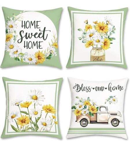 SLEP-Housse de Coussin Fleurs 45 x 45 cm Home Sweet Home Fleur Camion Ferme Décoratif Taie d'oreiller pour Canapé Chambre Maison Jardin Décoration 4 Pièces