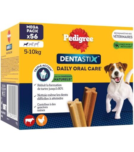 Bâtonnets dentaires pour chien permettant de réduire la formation de tartre jusqu'à 80% et contribuer à des gencives saines (scientifiquement prouvé)Texture légèrement abrasive et forme en ""X"" unique pour atteindre même les dents les plus difficiles d'accèsVéritables gourmandises pour chien pouvant servir de récompenses, faibles en matières grasses, sans sucres ajoutés, sans colorant ni arôme artificielsConditionnés en sachets pratiques pour une utilisation quotidienne (1 Dentastix / jour), Non adaptés aux chiots de moins de 4 moisContenu de la livraison 56 x Bâtonnets à Mâcher PEDIGREE DENTASTIX, 8 Sachets de 7, Saveur Poulet et B?uf Expédié depuis la France et arrive sous 7 jours. ...