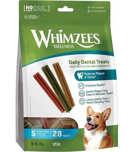 SOINS DENTAIRES QUOTIDIENS POUR CHIOTS Nos friandises ne font pas que compléter la routine alimentaire quotidienne de chaque chien - elles réduisent également la plaque et le tartre et rafraîchissent l'haleine.PRÉVIENT LA MAUVAISE HALEINE ET L'ACCUMULATION DE TARTRE Notre soin dentaire Triple Care pour chiens réduit la plaque dentaire, combat le tartre et lutte contre la mauvaise haleine chez les chiens; Pour une bonne hygiène buccale !FAIBLE EN CALORIES ET EN MATIÈRES GRASSES Les snacks WHIMZEES sont hypoallergéniques et végétariens et ne contiennent que des ingrédients naturels purs; Sans colorants, arômes, conservateurs ou OGM artificiels.TEMPS DE MATICATION PLUS LONG Nos friandises permettent un temps de mastication 3 fois plus long que les bâtonnets à mâcher concurrents; Bâtonnets durs avec une structure solide pour un plaisir de mastication prolongé.CHIENS DE PETITE RACE Nos snacks sont spécialement conçus pour les chiens de petite race (poids corporel de 7 à 12 kg); Pas pour les chiens de moins de 9 mois; Un bâtonnet par jour.SOINS DENTAIRES QUOTIDIENS POUR CHIENS Nos friandises ne font pas que compléter la routine alimentaire quotidienne de chaque chien - elles réduisent également la plaque et le tartre et rafraîchissent l'haleinePRÉVIENT LA MAUVAISE HALEINE ET L'ACCUMULATION DE TARTRE Notre soin dentaire Triple Care pour chiens réduit la plaque dentaire, combat le tartre et lutte contre la mauvaise haleine chez les chiens; Pour une bonne hygiène buccale !FAIBLE EN CALORIES ET EN MATIÈRES GRASSES Les snacks WHIMZEES sont hypoallergéniques et végétariens et ne contiennent que des ingrédients naturels purs; Sans colorants, arômes, conservateurs ou OGM artificiels.TEMPS DE MATICATION PLUS LONG Nos friandises permettent un temps de mastication 3 fois plus long que les bâtonnets à mâcher concurrents; Bâtonnets durs avec une structure solide pour un plaisir de mastication prolongé.CHIENS DE PETITE RACE Nos snacks sont spécialement conçus pour les chiens de petite race (poids corporel de 7 à 12 kg); Pas pour les chiens de moins de 9 mois; Un bâtonnet par jour. Expédié depuis la France et arrive sous 7 jours. ...