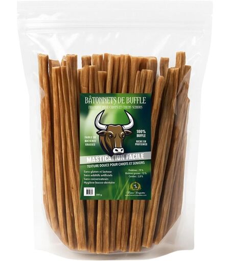 ¿ FRIANDISE À MÂCHER 100 % NATURELLE POUR CHIOTS & CHIENS SÉNIORS ¿ TEXTURE DOUCE & APPÉTENTE ¿ Nos bâtonnets de buffle sont élaborés à partir d¿intestins de buffle 100 % naturels, séchés à l¿air pour préserver leurs qualités nutritionnelles. Leur consistance plus tendre que les friandises classiques les rend parfaits pour les chiots en période de dentition ou les chiens âgés ayant une mâchoire plus fragile. Sans additifs, sans conservateurs, ni exhausteurs de goût, ces friandises pour chien sont une solution naturelle, saine et savoureuse pour combler leur besoin de mastication.¿¿ HYGIÈNE DENTAIRE & BIEN-ÊTRE BUCCAL ¿ RENFORCE LES DENTS, LIMITE LE TARTRE & LA MAUVAISE HALEINE ¿ La mastication régulière de ces friandises de buffle aide à réduire naturellement la plaque dentaire, à prévenir le tartre et à garder une haleine fraîche. Grâce à leur texture spécifique, ces friandises agissent comme une brosse à dents naturelle, renforçant les dents et les gencives tout en procurant un plaisir de mastication sain et bénéfique. Un geste simple pour préserver la santé bucco-dentaire de votre animal au quotidien.¿ FAIBLE EN GRAISSES & RICHE EN PROTÉINES ¿ IDÉAL POUR RÉCOMPENSER SANS CULPABILITÉ ¿ Avec 79 % de protéines et seulement 12 % de matières grasses, nos bâtonnets de buffle sont l¿encas idéal pour les chiens ayant besoin de garder la ligne ou sensibles à certaines intolérances alimentaires. Sans gluten, sans lactose, et sans céréales, ils conviennent parfaitement aux régimes alimentaires spécifiques. Une friandise saine, naturelle et nutritive, adaptée à toutes les races et toutes les tailles. SOUTIENT L¿INSTINCT DE MASTICATION NATUREL & FAVORISE L¿ÉQUILIBRE ÉMOTIONNEL ¿ Les chiots ont un besoin naturel de mâcher pour explorer leur environnement et soulager leurs gencives. En leur proposant nos bâtonnets de buffle, vous canalisez leur énergie, réduisez les comportements destructeurs (chaussures, meubles¿) et participez activement à leur éducation positive. Idéal également pour les chiens anxieux ou seniors ayant besoin d¿une stimulation orale douce et régulière. FORMAT PRATIQUE & ADAPTÉ À TOUS LES CHIENS ¿ ENTRE 150 G ET 500 G ¿ Nos bâtonnets mesurent environ 15 cm et sont proposés en sachets de 150 g à 500 g, pour s¿adapter aux besoins de chaque chien. Faciles à transporter et à conserver, ces friandises naturelles accompagneront vos moments d¿éducation, de récompense ou de détente. Chaque bâtonnet est unique sa couleur, sa forme et sa texture peuvent varier légèrement, garantissant l¿authenticité d¿un produit 100 % naturel. Expédié depuis la France et arrive sous 7 jours. ...