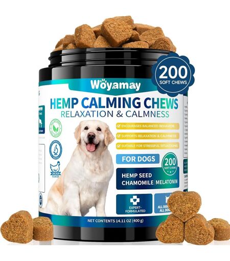CALMANTES POUR CHIEN ¿ SOUTIEN CONTRE LE STRESSVotre chien semble agité, aboie beaucoup ou réagit aux bruits forts ?Les friandises calmantes Woyamay (200 pièces), à base d¿ingrédients naturels, sont conçues pour soutenir la relaxation au quotidien, notamment dans les moments plus intenses comme les orages, les ou les périodes de changement.Leur formule douce aide votre compagnon à rester calme et serein, naturellement.AIDE À UN COMPORTEMENT CALME ET ÉQUILIBRÉ Utilisées régulièrement, ces friandises calmantes pour chien contribuent à aider à aider à gérer les réactions en moments de défi telles que les aboiements excessifs, la mastication destructrice et l¿agitation. Elles contribuent à un rythme plus serein au quotidien, permettant à votre chien d¿être plus serein, plus obéissant, et contribuent à une atmosphère paisible à la maison.SOUTIEN NATUREL ET DOUX À LA RELAXATION Nos calmants pour chien sont appréciés par les propriétaires d¿animaux. Chaque bouchée contient des ingrédients d¿origine naturelle utilisés dans les routines. Une formule douce adaptée aux routines quotidiennes adaptée aux chiens de tous âges et de toutes races.SOUTIEN DURABLE À LA RELAXATION Les friandises calmantes Woyamay commencent à agir progressivement. Elles offrent un soutien doux pour une longue durée, idéal pour accompagner les moments de séparation, les voyages ou les orages. Un soutien quotidien pour le bien-être de votre compagnon à quatre pattes.DÉLICIEUSES FRIANDISES SAVEUR POULET Ces bouchées molles au goût savoureux de poulet sont irrésistibles, même pour les chiens les plus difficiles. Parfaites pour un usage quotidien ou comme récompense pendant l¿éducation, elles allient plaisir et relaxation. Le pack de 200 pièces garantit un stock durable de soutien calmant.ATTENTION Nous mettons à jour le texte de l'emballage pour plus de clarté. Le texte peut être différent, mais le design et la qualité du produit restent inchangés. Expédié depuis la France et arrive sous 7 jours. ...