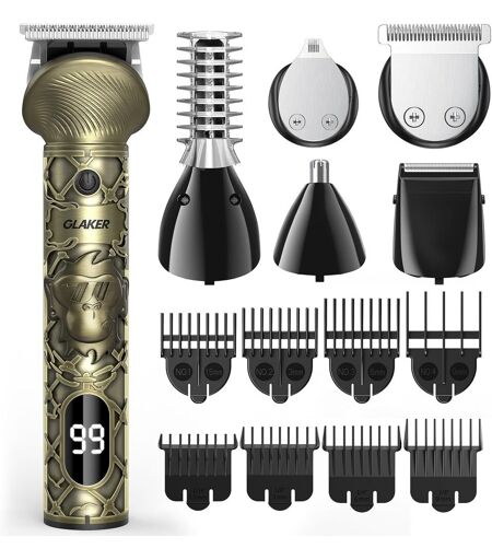 6 EN 1 Kit Styling Homme La professionnell tondeuse cheveux tout-en-un pour hommes est livrée avec 6 têtes de coupe différentes pour répondre à tous vos besoins de toilettage, et adaptés pour tailler la barbe, le rasage, les oreilles & le nez, les corps, les cheveux et pour la précisionLame Ultra-AffûtéeLes lames en acier inoxydable longue durée garantissent un tranchant optimal à chaque utilisation, ce qui rend ce tondeuse idéal pour un entretien régulier sans avoir à se soucier de la rouille. Il se rince facilement sous le robinetDoux pour la PeauLa tondeuse corps homme GLAKER offre une coupe précise et douce, réduisant les entailles et les coupures. Elle protège la peau même dans les zones les plus sensibles150 Minutes Sans FilGrâce à une puissante batterie lithium-ion, cette tondeuse cheveux hommes offre jusqu'à 150 minutes durée d'exécution sans fil. L'écran LED indique l'état de charge et le niveau de batterie restant, ce qui vous permet de savoir quand recharger8 Sabots PeigneLa tondeuse à barbe permet un contrôle précis de la longueur et du style souhaités. 4 sabot tondeuse de finition pour des coupes de cheveux courtes (1/16"") à longues (3/8""). 4 sabot tondeuse barbe taillent de la barbe de quelques jours à la barbe complèteQu'est-ce qui est inclus17 Pieces Kit tondeuse barbe, tondeuse à cheveux, tondeuse de précision, tondeuse corps, rasoir electriques, tondeuse nez oreilles, 8 sabots peigne, huile lubrifiante, brosse de nettoyage, câble de charge USB-C (adaptateur non inclus) Expédié depuis la France et arrive sous 7 jours. ...
