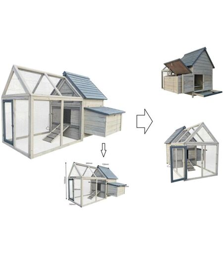 #Description# Ce poulailler pratique comporte deux zones reliées entre elles. Ce modèle combine donc une maison abritée pour dormir et se reposer avec un enclos en plein air pour picorer et se gratter. Les dimensions globales du poulailler sont généreuses : 166 x 118,5 x 112 cm. La maison possède un grand nichoir sur un côté avec un couvercle à charnière. Il peut être ouvert si nécessaire, afin que l'intérieur soit facilement accessible. Cela vous permet de chercher des poules en nidification ou de sortir votre oeuf de petit déjeuner. Pour vous assurer que vous pouvez facilement accéder à l'intérieur de l'enclos de libre parcours ou pour donner à vos poulets un peu plus d'espace pour courir, il y a une porte à l'avant de l'enclos. Sous le nichoir, il y a une coque galvanisée qui peut être retirée. Cela permet de nettoyer facilement le sol de la maison. Le poulailler était fait de bois de haute qualité et peint en brun et blanc. La couleur ne donne pas seulement un aspect moderne, mais ...