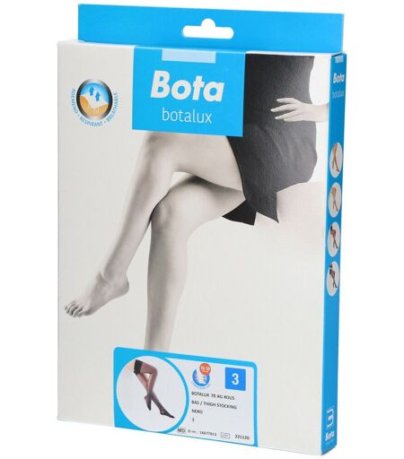 Bota Botalux 70 AG+P Bas de soutienBas de soutien 70 denier (15/18 mm Hg)Taille 3Couleur : NoirComposition81% Polyamide, 19% ElastodièneIndicationsJambes fatiguées/lourdesProfession debout/sédentaireGrossesseConditionnement1 paire ...