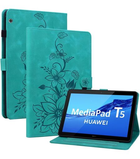 Kal-Coque Pour Huawei Mediapad T5 10.1 Pouces 2018 Modèle Ags2-W09/W19/L09, Multi-Angles De Visualisation Housse De Protection En Similicuir Avec Porte-Carte Couverture Motif Lys, Vert