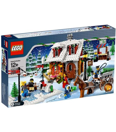 Cette petite ville recouverte de neige est un véritable plaisir pour les yeux ! Un sapin prêt à être décoré arrive chez le marchand d'arbres dans un chariot tiré par un cheval, pendant que des patineurs s'amusent sur la mare gelée avec des lumières colorées et une curieuse chouette. Attention aux bancs de neige : un patineur y est déjà tombé la tête la première ! Dans la boulangerie, le sympathique boulanger prépare de délicieuses spécialités de Noël dans son four et encaisse les achats. Appuie sur la brique lumineuse LEGO Power Functions pour éclairer l'intérieur du bâtiment ! Comprend 7 figurines, une chouette, un cheval et de nombreux accessoires hivernaux. - Comprend 7 figurines, une chouette et un cheval ! - Appuie sur la brique lumineuse LEGO Power Functions pour illuminer l'intérieur de la boulangerie ! - Comprend de nombreux accessoires hivernaux, notamment une cagoule bleue foncée avec un nouvel imprimé imitant la fourrure ! - Prépare des spécialités de Noël et encaisse les achats ! - Patine sur la mare gelée en plaques bleues transparentes de 8x8 ! - Les accessoires comprennent un appareil photo, des baguettes dorées, des croissants, une pomme verte, des plaques bleues transparentes de 8x8, des tuiles bleues moyennes et même plusieurs briques et éléments d'arches "caramel" à l'extérieur de la boulangerie ! - Comprend un sapin à décorer, un marchand d'arbres et même un chariot tiré par un cheval ! - La boulangerie mesure 18 cm de large ! - Le modèle (en fonction de l'espace entre les différentes parties) mesure 40 cm de large, 30 cm de profondeur et 18 cm de haut ! Collection Winter Village. ...