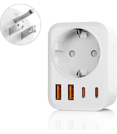 Adaptateur type A et B : Adaptateur prise type B DE Schuko européen 2 broches VERS USA 3 broches États-Unis, Canada, Mexique, Colombie, Thaïlande, Samoa américaines, Antigua-et-Barbuda, Aruba, Bahamas, Barbade, Belize, Bermudes, Îles Caïmans, Costa Rica, Cuba, République dominicaine, Équateur, El Salvador, Guam, Guatemala, Guyane, Haïti, Honduras, Jamaïque, Jordanie, Laos, Liban, Nicaragua, Niger, Palaos, Panama, Pérou, Philippines, Taïwan, etc. (Pas pour le Japon). Adaptateur prise USA 5 en 1 : l'adaptateur secteur USA dispose de 1 prise secteur (Schuko européen à 2 broches) + 2 ports de type C + 2 ports USB. Vous pouvez charger 5 appareils simultanément à grande vitesse. 2 ports USB chargent jusqu'à 3,4 A et le port USB-C est compatible avec des appareils tels que les téléphones portables, les Macbooks, les ordinateurs portables et les casques Bluetooth. La puissance de sortie maximale peut atteindre 3750 W (max. 250 V, 15 A) pour répondre à vos besoins de charge en voyage. Sécurité pour vous et votre équipement : Notre adaptateur USA est équipé d'un système de sécurité certifié CE, RoHS et FCC. Avec une protection contre les surtensions, une protection contre les courts-circuits, un contrôle de la température, une coque PC ignifuge et une structure à double isolation, il assure la sécurité des utilisateurs et de leurs appareils. Cela empêche les enfants d'entrer en contact direct avec la partie sous tension de l'adaptateur de prise et empêche les objets étrangers de pénétrer dans la prise. Conception portable, facile à transporter : la prise adaptateur américaine ne mesure que 7 x 5 x 7 cm, optimisée pour être plus compacte et portable que les adaptateurs américains similaires sur le marché. Il répond à vos besoins de voyage et économise beaucoup d'espace dans vos bagages. L'adaptateur de prise USA est destiné aux voyages, aux voyages d'affaires, aux vacances, à la maison et au bureau et peut convertir les adaptateurs UE en adaptateurs de voyage USA en peu de temps. Adaptateur de haute qualité prise USA Allemagne : branchez simplement l'adaptateur de voyage USA entre l'appareil et la prise pour connecter l'appareil facilement et de manière fiable. L'adaptateur de voyage s'insère fermement dans la prise sans vaciller ni tomber. L'adaptateur de prise USA peut être utilisé dans les chambres, les salles de bains, les cuisines, les hôtels et plus encore. Emportez cet adaptateur de voyage américain de haute qualité avec vous lorsque vous voyagez de l'Europe vers l'Amérique du Canada ! Contenu de la livraison : 1 x prise de voyage USA blanche..La livraison depuis la France est prévue dans 5 jours ouvrés, n'hésitez pas à passer votre commande ...
