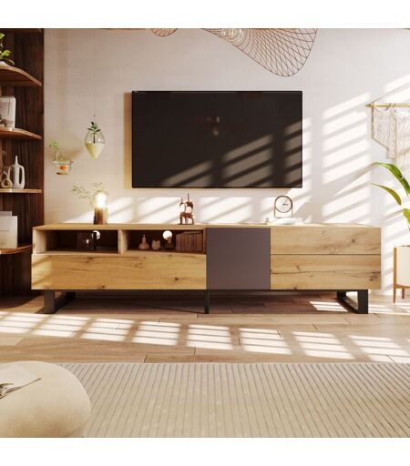 Dans Les Nuages - Meuble tv 180 cm, avec 2 tiroir, 2 portes, 2 compartiment ouvert, pieds en métal, vintage industriel, chêne sauvage couleur,