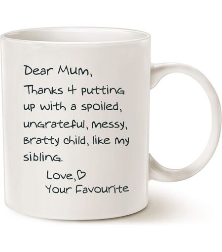 Mother's Day Gifts Funny Mum Coffee Mug, Dear Mum Thanks 4 Putting Up With A Spoiled Love Your Favourite Christmas Gifts For Mum Mother Porcelain Cup, White 11 Oz