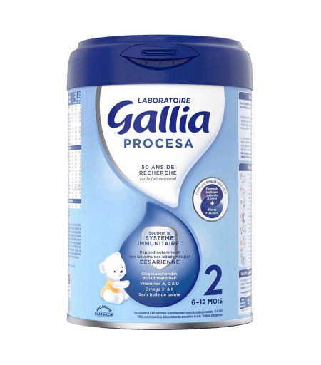 Gallia Procesa est une lait infnatile conçu pour soutenir le système immunitaire des bébés nés par césarienne. Il contient des vitamines A, C et D, qui participent au fonctionnement normal du système immunitaire et apporte aussi des oméga-3 et 6. Sa formule ne contient pas d'huile de palme.Il est destiné aux enfants âgés de 6 mois à 1 an. La lait maternel est l’aliment idéal et naturel du nourrisson : il est le mieux adapté à ses besoins spécifiques. Une bonne alimentation de la mère est importante pour la préparation et la poursuite de l’allaitement au sein. L’allaitement mixte peut gêner l’allaitement maternel et il est difficile de revenir sur le choix de ne pas allaiter. En cas d’utilisation d’une préparation infantile, lorsque la mère ne peut pas ou ne veut pas allaiter, il importe de respecter scrupuleusement les indications de préparation et d’utilisation et de suivre l’avis du corps médical. Une utilisation incorrecte pourrait présenter un risque pour la santé de l’enfant. Les implications socio-économiques doivent être prises en considération dans le choix de la méthode d’allaitement. ...