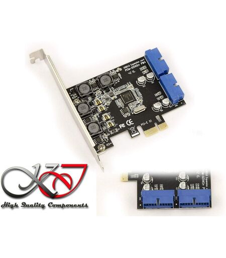 Pour PC DE BUREAU sur port PCI EXPRESS 1X. Permet de rajouter 4 ports USB 3.0 sur votre PC de bureau par le biais de deux ports internes USB3 19 broches. - Compatible avec toutes les versions de Windows (2000, XP, VISTA, SEVEN, 8, 10.... EN 32 OU 64 bits). - Equip?e d'un chipset NEC ?PD720201. Interface PCIe 1x (PCIe 2.0) - Carte auto aliment?e par le port PCIe - Carte fournie avec deux ?querres : low et high profile. ...