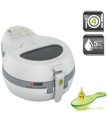 Friteuse Sans Huile SEB ActiFry Original La friteuse sans huile SEB ActiFry Original vous permet de préparer des frites croustillantes et savoureuses avec seulement 3 % de matière grasse. Caractéristiques principales Capacité de 1 kg, idéale pour 4 personnes Puissance de 1400 W pour une cuisson homogène Grâce à sa pale de brassage automatique, il n'est plus nécessaire de préchauffer ou de remuer les aliments. ...