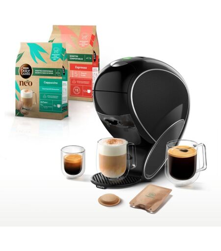 Découvrez la machine à café Dolce Gusto NEO par KRUPS La machine à café Dolce Gusto NEO par KRUPS, référence constructeur neo noir KP850810, est l'outil idéal pour les amateurs de café et de boissons lactées. Pensée pour offrir une expérience utilisateur optimale, cette machine combine efficacité, simplicité, et respect de l'environnement. Compatible avec les capsules Dolce Gusto NEO, cette machine permet de préparer aussi bien des expressos que des cafés longs selon vos préférences. Grâce à son réservoir d'eau amovible d'une capacité de 1,3 L, soit environ 10 tasses, vous pouvez facilement préparer plusieurs boissons avant de le remplir à nouveau. Caractéristiques techniques et fonctionnalités Types de boissons : café et boissons lactées Type de capsules compatibles : Dolce Gusto NEO Capacité du réservoir : 1,3 L (10 tasses) Bac à capsules : Oui Support de tasses : ajustable en hauteur Arrêt automatique : Oui Connectivité : Oui, ajustement de la température et de la taille des boissons via application, participation au programme de fidélité Premio Arrêt de l'écoulement : automatique Durée de préchauffage : 30 secondes Puissance : 1.600 W Pression : 15 bars Indicateur de détartrage : Oui Dimensions (l x h x p) : 15 x 33.9 x 40.1 cm Poids net : 4,47 Kg Couleur : Noir Finition : plastique Fabriqué en : Chine Un des atouts majeurs de cette machine est son aspect éco-conçu, avec des dosettes NEO compostables à la maison et des sachets à base de papier. De plus, l'application connectée vous permet de régler la température et la taille de votre boisson pour une expérience sur mesure. La combinaison d'une puissance de 1.600 W et d'une pression de 15 bars assure une extraction parfaite de chaque arôme de vos cafés préférés. Enfin, avec un temps de préchauffage de seulement 30 secondes, la Dolce Gusto NEO vous permet de profiter de vos boissons rapidement, sans compromis sur la qualité. Adoptez dès à présent la Dolce Gusto NEO par KRUPS et découvrez une nouvelle dimension du plaisir caféiné, à la fois sophistiquée et respectueuse de l'environnement. ...
