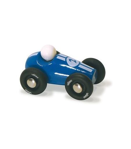 Voiture de course bleue d'une longueur de 8 cm. Cette voiture de course est un jouet en bois fabriqué en France (Jura) par la société VILAC. ...