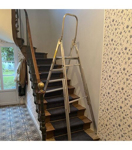 Description générale Échelle polyvalente conçue pour s'adapter à des escaliers ou des sols inégaux, offrant une multitude de possibilités d'ajustement des pieds. Idéale pour tous types d'escaliers, qu'ils soient droits, en colimaçon, quart tournant ou étroits, elle est parfaite pour les chantiers de rénovation, tels que la peinture ou la création de faux plafonds. Spécifications techniques Marches striées antidérapantes de 90 mm de profondeur. Deux pieds de dénivellation indépendants pour un ajustement maximal de 800 mm. Réglage des pieds par crans tous les 17 mm. Garde-corps repliable pour un encombrement réduit lors du transport. Facilité de rangement, compatible avec le coffre d'une voiture. Garde-corps de sécurité de 650 mm de hauteur pour prévenir les chutes. Système de blocage de la plateforme par compas lors du dépliage. Plateforme antidérapante de 310 x 290 mm pour un confort optimal. Patins en caoutchouc antidérapants pour une meilleure stabilité. Compatibilité et accessoires ...