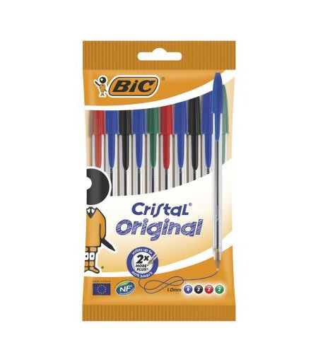Pochette de 10 stylos à bille Bic - pointe moyenne - 4 couleurs d'encre - corps plastique transparent cristal