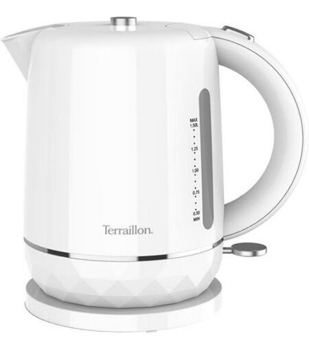Bouilloire sans fil Terraillon 15351 au design élégant Diamant. Avec son design unique et son coloris blanc, les éléments de cette collection s'intègrent facilement dans de nombreux intérieurs, classiques ou contemporains. Incontournable du petit-déjeuner et de la pause café, cette bouilloire trouvera parfaitement sa place sur le plan de travail de votre cuisine. Une bouilloire stylée qui vous apportera de l'eau chaude pour toutes vos préparations ! Type de produit : Bouilloire électrique. Socle 360°. Ouverture et remplissage d'une seule main. Fond inox. Résistance cachée. Indicateur du niveau d'eau sur 2 côtés. Arrêt automatique. Voyant lumineux de mise en marche. Bouton marche / arrêt rétroéclairé. Range-cordon : 70 cm. Le + produit : Filtre anti-calcaire amovible pour une eau plus pure. Puissance : 2200 W. Capacité : 1,5 L. Coloris : Blanc. Dimensions (LxHxP) : 15 x 24 x 22 cm. Poids net : 0,97 Kg. ...
