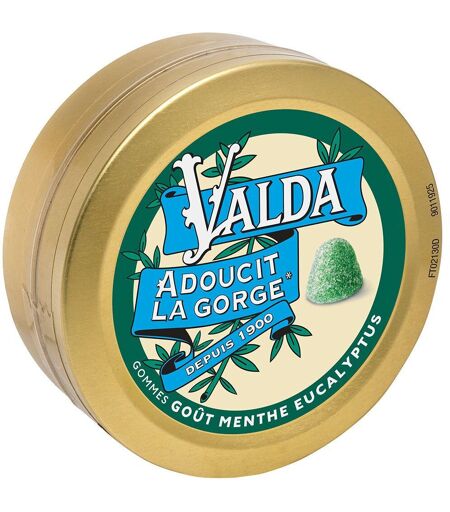 Il est important d'avoir une alimentation variée et équilibrée et un mode de vie sain.VALDA Gommes Avec Sucres Goût Menthe eucalyptus - 5 g Depuis plus de 12 ans, les gommes Valda vous accompagnent pour adourcir votre gorge au quotidien. Savourez les dans leur version goût menthe eucalyptus avec sucres, pour encore plus de plaisir! Grâce à leur format de poche 5g, emportez vos gommes Valda partout avec vous. Composition: Sirop de glucose, Sucre, Gélatine, Aromatisants : Menthol (0.4%) et huille essentielle d'Eucalyptus (0.08%), Colorants : Cucurma et Bleu patenté V.Valeur nutritionelle: Pour 100 gEnergie1516 kJ/362 kcalMatières grasses0,0 gdont acides gras saturés0,0 gGlucides80,5 gdont sucres80,5 gdont polyols0,0 gFibres alimentaires0,0 gProtéines8,7 gSel0,127 gConseil d'utilisation:Sucer une pastille quand nécessaire.Précautions d'emploi:A conserver à une température ne dépassent pas +25°C.Poids net:50 gFabricant:Laboratoires Omega PharmaBP 8092321 Châtillon Cedex ...