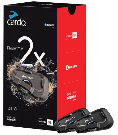 Intercom Bluetooth CARDO FREECOM 2X DUO. Jusqu’à 2 utilisateurs avec une portée de 800m. Sound by JBL : puissants haut-parleurs de 40 mm haute définition et contrôle du volume automatique. Processeur de musique spécialement réglé. Application Cardo Connect. Conception étanche. Radio FM : fréquences de fonctionnement de 76 à 108 (Radio Data systems) avec 6 stations préréglées en mémoire. Connectivité : 2 canaux pour téléphone mobile et GPS. Bluetooth 5.2, connectivité universelle et connectivité TFT. Reconnexion automatique, intercom audio HD Bluetooth. Durée de conversation : 13h. Durée de charge : jusqu’à 2h. Charge rapide : 2h d’autonomie en conversation après 20 minutes de charge. Durée en veille :10 jours. ...