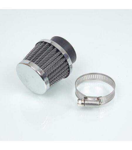 Cornet de filtre à air chromé neuf type K & N diamètre 35 mm. Le filtre à air mesure 70mm de longueur totale, 62mm au diamètre le plus grand et 51mm de diamètre à son extrémité. Vendu à l'unité avec collier de serrage. Livré conforme à la photo. ...