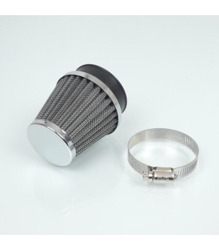 Cornet de filtre à air chromé neuf type K & N diamètre 54mm. Le filtre à air mesure 87mm de longueur totale, 74.5mm au diamètre le plus grand et 51mm de diamètre à son extrémité. Vendu à l'unité avec collier de serrage. Livré conforme à la photo. ...