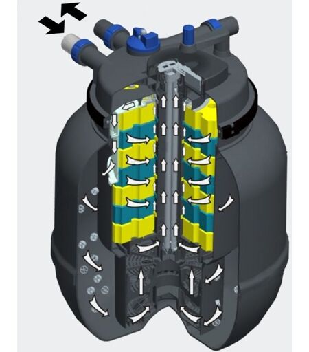 Filtre à pression CPF-50000 Filtre à pression biologique ------ La série de filtre de pression à bassin CPF fait partie de la toute nouvelle génération de filtration de bassins, étant donné quelle combine nettoyage mécanique et biologique avec la technologie UV la plus moderne. Le filtre de bassin biologique CPF 50000 veille à préserver un équilibre biologique dans les grands bassins et améliore considérablement la qualité de leau, et ce sans substances chimiques. Ce système se distingue par sa capacité à clarifier leau pour des bassins sans poissons dune taille allant jusquà 80 000 l et allant jusquà 40 000 l avec poissons. Le système de filtration doit être mis en service pendant 24 h afin dassurer un climat sain, une végétation luxuriante et le bien être des poissons. Lefficacité de la filtration est atteinte grâce à des matériaux de filtration tels que desboules biologiques , deséponges bleues et jaunes spéciales avec différentes vitesse découlement et un stérilisateur UVC, munie dune lampe UVC incorporée, grâce à laquelle les algues sont éliminées de leau. Le débit deau maximal est de 13000 l/ h. Il est possible de pomper leau jusquà une hauteur de 3 m, selon bien sûr la puissance de la pompe utilisée. Ce filtre à pression possède un système dauto nettoyage assez simple: Dune part, le système de filtration est muni dun indicateur de saleté, et dune autre, dune fonction de nettoyage aisée. En outre, vous pouvez facilement presser les filtres à laide dune manivelle, sans que vous ayez à ouvrir le système. En cas dencrassement important, vous pouvez facilement enlever les accessoires pour les nettoyer. Il suffit juste douvrir le couvercle pour ce faire. Par une grande capacité de nettoyage, ce système de filtration de bassin ne présente aucun problème ni au niveau de linstallation, ni au niveau du maniement ni au niveau de lentretien. Données techniques------ Filtre à pression CPF-50000 Filtre à pression biologique Référence 51187 Tension d'entrée 230V ~ 50Hz UVC-puissance 18 Watt Consommation 18 W Raccordement de tuyau Ø / Pouce 20mm - 38mm (3/4 Pouces - 1 1/2 Pouces) Volume / capacité 38 Litres Taille du bassin avec des poissons à 15.000l Taille du bassin sans poisson à 30.000l Recommandé quantité écoulement 10.000 l/h ...