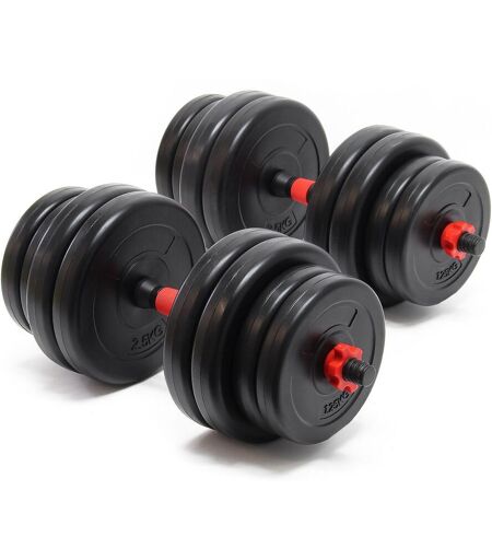 Enrichissez vos séances de gymnastique et de musculation grâce à un équipement se composant d un kit d'haltères de 30 kg. Les haltères courts permettent un travail ciblé des différents groupes musculaires dans le but d'atteindre un effet d'entraînement maximal. En outre, l avantage de cette forme d entraînement réside dans le fait que le corps déploie, par différents exercices, un minimum de mouvement en guise de compensation. En effet, le corps essaie de maintenir son équilibre et de conserver une position stable. Les mouvements de stabilisation veillent également à renforcer votre profonde musculature, de sorte à travailler la stabilité de l ensemble du corps. Le set contient huit plaques de poids, ayant chacune un poids de 1,25 kg. Le set contient aussi huit plaques de poids, ayant chacune un poids de 2,5 kg ; ainsi que deux barres d?haltères courts. Les barres d haltères de 505 mm de longueur sont équipées de verrous clés étoile et d une surface nervurée pour une prise en main sûre. Un entrainement réussi dépend fortement de sa régularité et de sa continuité. Ce qui signifie une augmentation progressive du poids durant l entrainement. Attention : cela ne signifie pas un doublement du poids de manière abrupte et du jour au lendemain. Seule une progression graduelle et régulière du poids renforce la musculature. Une forme d entraînement progressive est possible grâce aux plaques de poids en fonte et de poids différents. Vous pouvez maintenant entamer votre entrainement. Les haltères se prêtent à différentes variétés d exercices, comme les boucles de marteau, les élévations latérales, le tirage d un bras avec un haltère, le développé-couché, le rowing à deux bras. Ainsi, vous gagnerez plus d autonomie, indépendamment des heures d ouverture et des emplacements des studios de gymnastique et de fitness. Poids : ? 8 Disques d haltère, chacun de 1,25 kg ? 8 Disques d haltère, chacun de 2,5 kg ? 2 Barres d'haltères courtes 0,35 kg Dimensions: Barres d'haltères courts Diamètre : 25 mm Longueur : 505 mm Surface de prise en main : 75 x 32 x 32 mm Plaques de poids Diamètre du perçage : 26 mm Plaque de poids 1,25 kg : Ø 180 mm x 31 mm Plaque de poids 2,5 kg : Ø 220 mm x 39 mm Matériau: Fonte et Plastique 8 x Plaque de poids 1,25 kg 8 x Plaque de poids 2,5 kg 4 x Serrure à étoile 2 x Barre de musculation ...