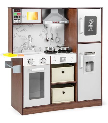 Caractéristiques : Apporte une expérience immersive avec des lumières et des sons Les enfants peuvent faire tourner les boutons pour émettre des clics Tableau supplémentaire pour que les enfants puissent écrire ou dessiner Permet aux enfants de simuler le lavage, le découpage, la cuisson ou la pâtisserie Contient une machine à glaçons permettant aux enfants de placer des glaçons et d'appuyer pour obtenir des glaçons Offre suffisamment d'espace de rangement, dont 1 porte-serviettes, 1 rôtissoire de rangement, 2 tiroirs en tissu et 3 crochets de suspension Les matériaux sans BPA ne nuisent pas à la santé des enfants Livré avec de nombreux accessoires, dont 1 poêle et casserole, 1 planche à découper et couteau, 1 tasse et 2 glaçons, 3 ustensiles de cuisine et 4 légumes à découper Idéal pour la chambre d'enfant, la crèche, le salon, la maternelle et la salle de jeux Spécifications Couleur : Café Matériau : MDF Dimension hors tout : 90 x 29 x 90 cm (L x l x H) Hauteur du comptoir : 49 cm Âge applicable : 3 ans et plus Poids net : 16 kg Livraison : Le colis comprend : 1 x ensemble de jeu de cuisine pour enfants 1 x toque de chef 1 x tablier 1 x chiffon 1 x poêle 1 x casserole avec couvercle 1 x planche à découper 1 x couteau 1 x tasse 2 x tiroirs en tissu 3 x ustensiles de cuisine 4 x légumes coupés 1 x manuel ...