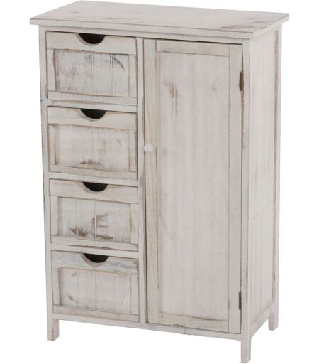 Commode petit meuble de rangement style vintage 82x55x30cm blanc vieilli Fabriqué à partir de bois de paulownia massif Porte avec compartiment de rangement 4 tiroirs Design moderne Dimensions hors tout (environ) : Hauteur : 82cm Largeur : 55cm Profondeur : 30cm Dimensions intérieures d'un tiroir (environ) : Hauteur : 14,5 cm Largeur : 20,5 cm Profondeur : 22,5 cm Dimensions intérieures du compartiment de rangement (env.) : Hauteur : 35cm Largeur : 24cm Profondeur : 23cm Épaisseur du bois des façades (env.) : 1,5 cm Nous ne faisons pas d'expédition sur les îles (Corse inclue), Monaco et les DOM/TOM Décoshop26 04_0002489 ...