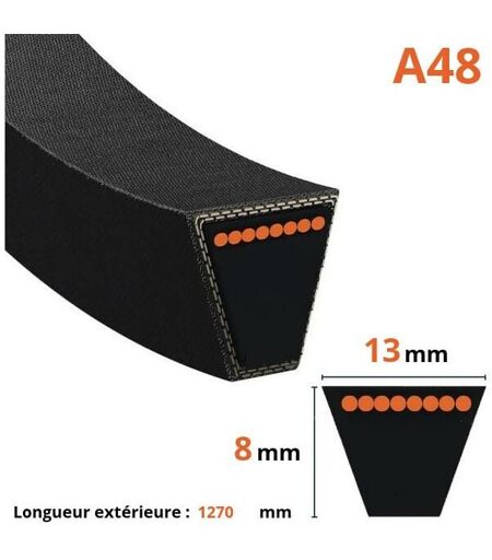 Courroie lisse trapézoïdale A48 Caractéristiques : Type : Trapézoidale lisse Largeur : 13mm Epaisseur : 8mm Description : Profil : A (13x8mm) Longueur extérieure : 1270mm Longueur intérieure : 1220mm Marque : MITSUBOSHI Un conseiller est à votre écoute pour tous renseignements. ...